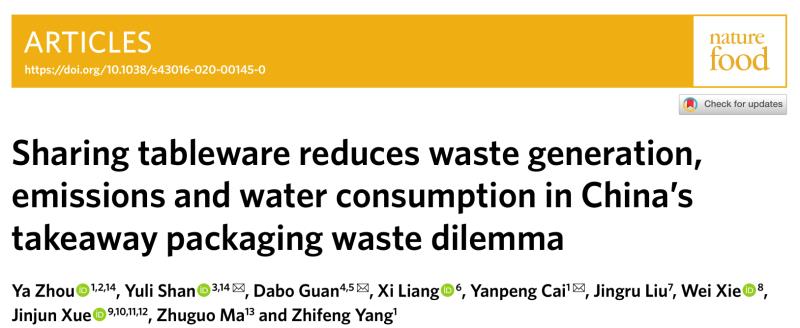 9月15日,环境生态工程研究院周雅副教授以第一作者在国际顶级期刊Nature Food(《自然•食物》)发表题为Sharing tableware reduces waste generation, emissions and water consumption in China’s takeaway packaging waste dilemma(共享餐具减少垃圾、排放和水资源消耗,破解中国外卖包装垃圾难题)的研究长文,研究首次定量我国城市外卖垃圾产量及生命周期环境影响,提出共享餐具可为我国外卖包装垃圾减量、塑料污染治...