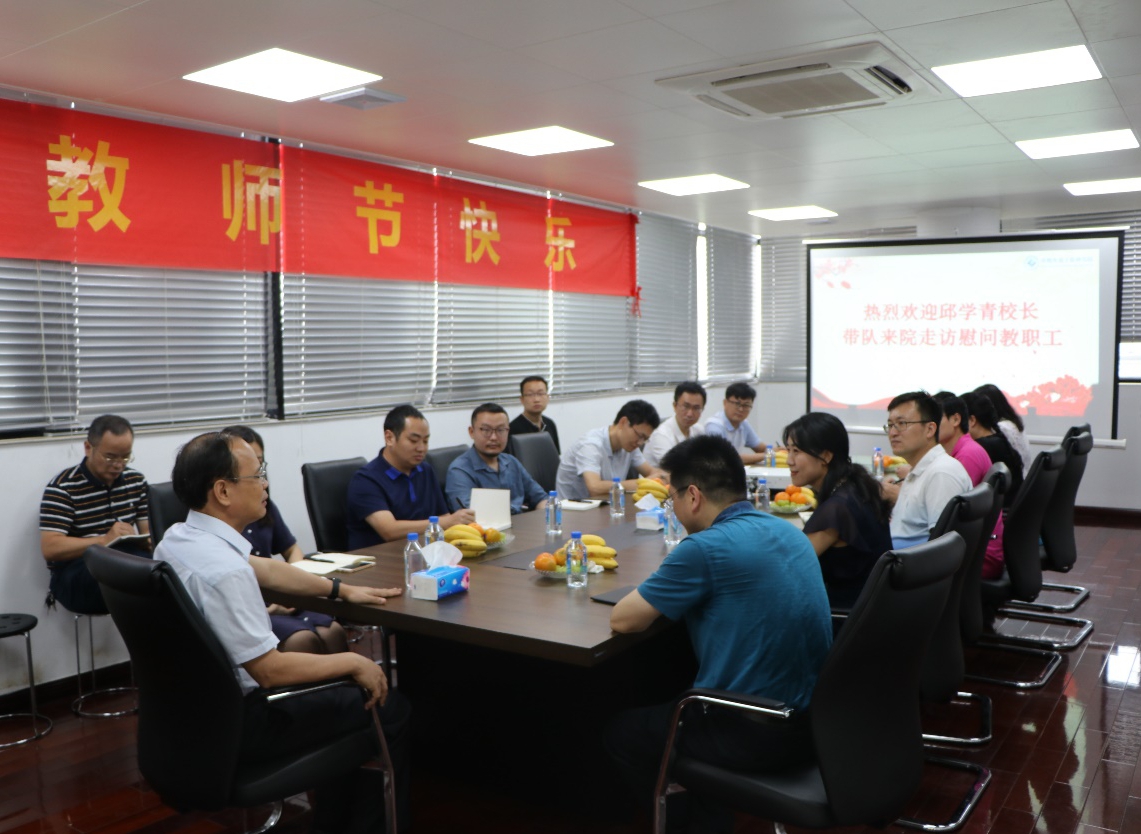 9月9日上午,在我国第36个教师节来临之际,学校校长邱学青、人事处处长刘强等一行3人走访环境生态工程研究院,亲切慰问辛勤耕耘在教学科研一线的教职员工。邱校长高度肯定了研究院在人才培养、团队建设等方面取得的成绩,并对研究院寄予厚望,继续保持高速发展态势,加强人才引育,优化人才队伍,成为学校的标杆和旗帜,打造国际人才高地。 研究院曾志英副书记代表全体教职员工对学校给予的关心和支持表示感谢,将抓住历史机遇,齐心合力为学校的高水平发展贡献力量。