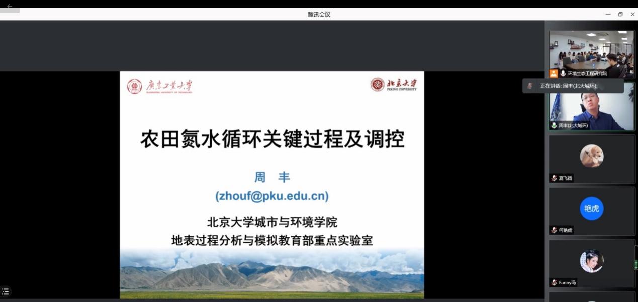 师生作题为“农田氮水循环关键过程及其调控”学术报告。周丰博士是北京大学城市与环境学院副教授、教育部高层次人才青年项目。会议由研究院蔡宴朋教授主持,采用线上线下结合方式开展,研究院江进教授、高伟副教授以及数十名师生代表参加了本次报告会。