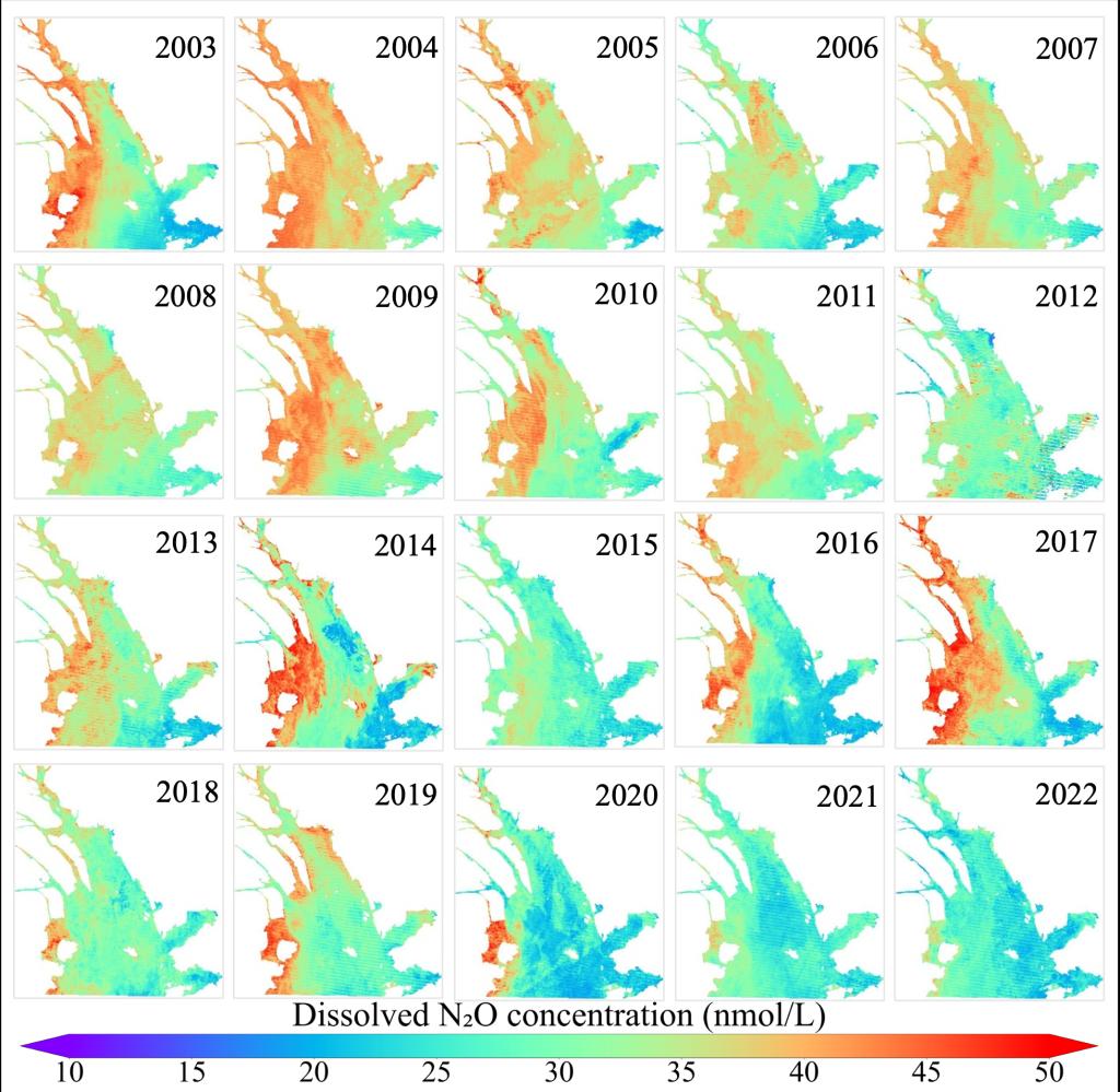 图1. 2003年至2022年珠江口N2O浓度的空间分布