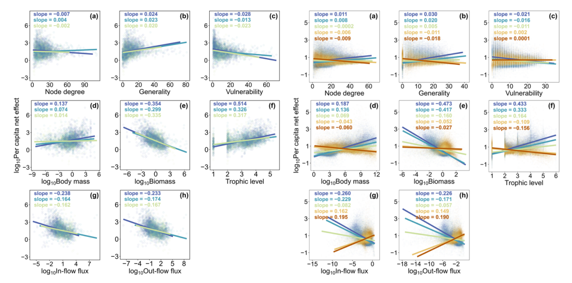 在金字塔结构的模拟食物网中,线性估算的物种净效应与非线性模拟的生物量响应之间呈现高度一致性。但在倒金字塔结构的食物网中,两者相关性显著下降,波动性加大。
