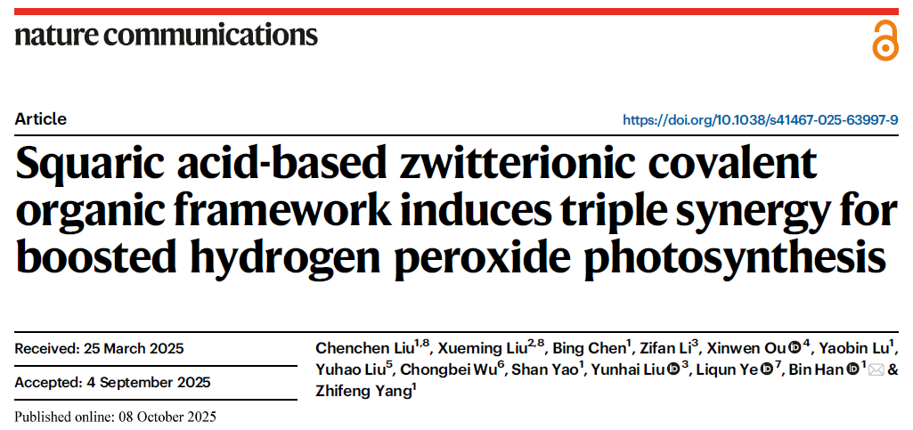杨志峰院士团队韩彬教授课题组在Nature Communications上发表了题为“Squaric acid-based zwitterionic covalent organic framework induces triple synergy for boosted hydrogen peroxide photosynthesis”的研究论文。韩彬教授为论文通讯作者,漫画人