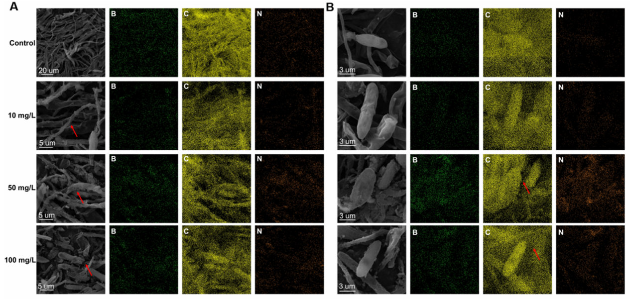 研究结果表明,根部施用50 mg/kg的nano-BN可使受镰刀菌侵染作物的地上部生物量提高64.9%,使光合参数恢复至接近健康水平。nano-BN通过破坏镰刀菌菌丝和孢子的超微结构,直接抑制病原菌生长,并使镰刀菌毒素(如白僵菌素和镰孢菌素)产量降低63%以上,从源头上减轻了对植物的毒害。代谢组学结果表明,nano-BN通过增强谷胱甘肽代谢途径,使谷胱甘肽和抗坏血酸含量显著增加166.67%和478.78%,有效缓解了病原菌引发的氧化损伤。