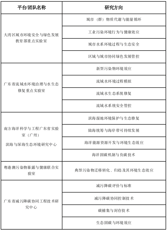 ·平台支撑:学院建有大湾区城市环境安全与绿色发展教育部重点实验室、广东省流域水环境治理与水生态修复重点实验室等6个省部级平台。