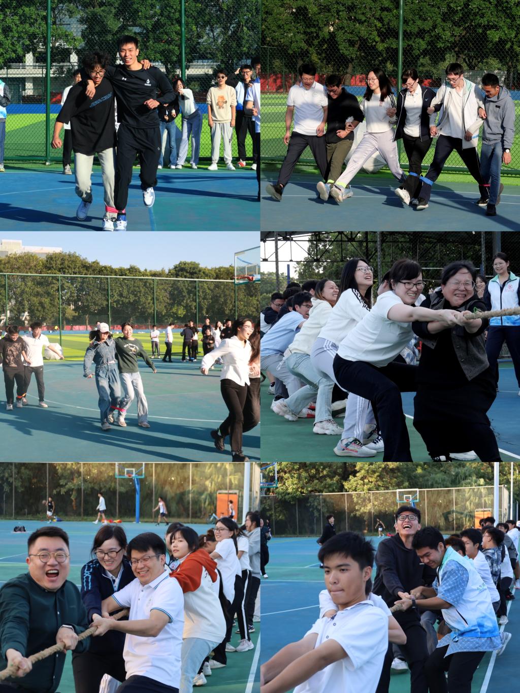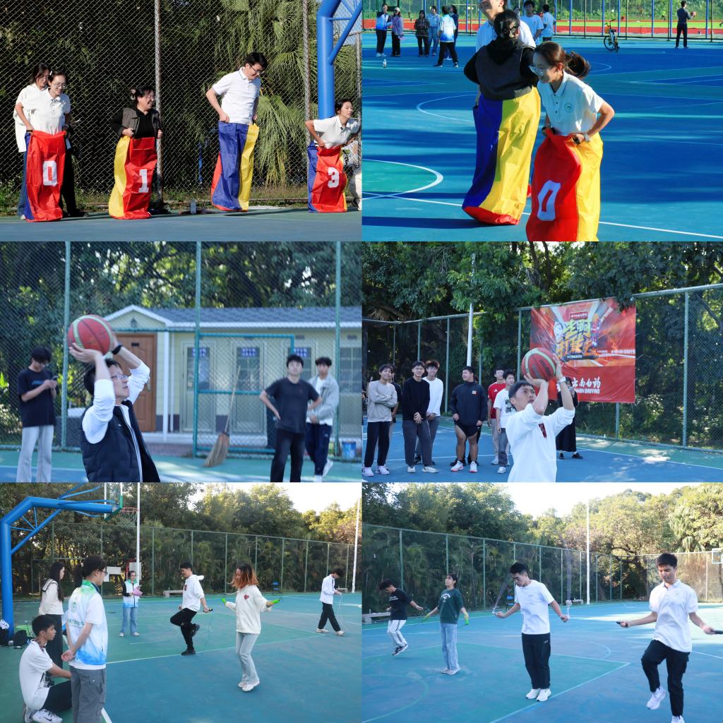 运动项目丰富多彩——袋鼠跳、定点投篮、1分钟跳绳等个人项目和两人三足、拔河等团体项目集趣味性、竞技性、互动性于一体,师生们在比赛中携手并进,挥洒汗水。现场观众掌声和喝彩声此起彼伏,整个运动场洋溢着无限的青春热情。
