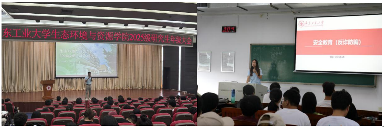 校园安全,你我共建。入学教育期间,学院研究生新生辅导员刁衍斌、本科生新生辅导员欧少珍分别组织召开了安全教育年级大会,从防诈骗防刷单、交通安全、宿舍用电与消防安全等多个维度,强调集体环境中自我防护与互助互警的重要性,引导同学们将安全知识转化为日常行为习惯,真正实现“安全意识入脑入心”。
