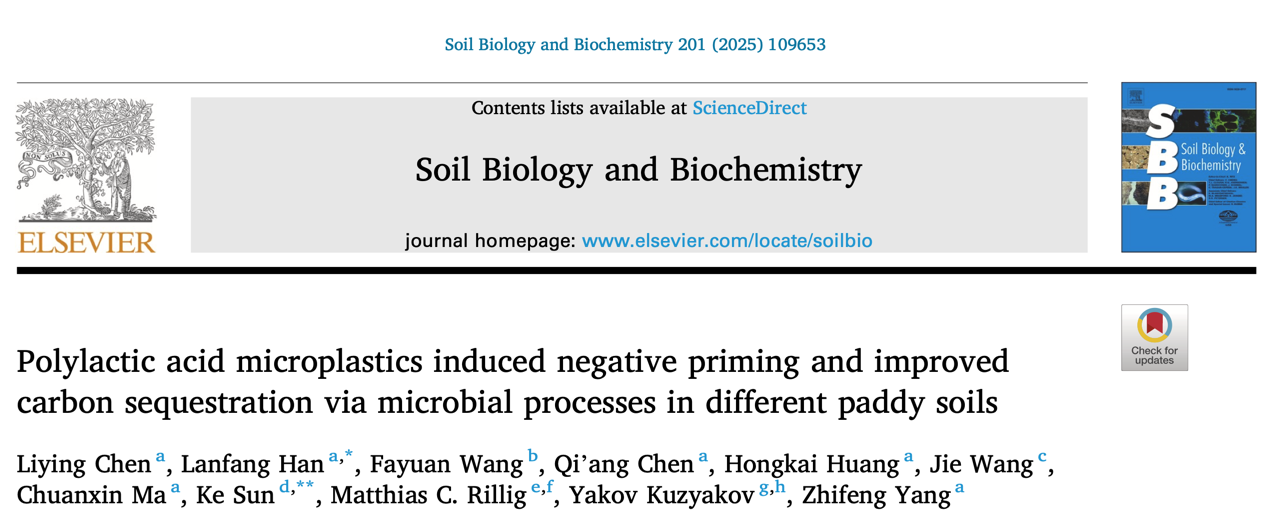 杨志峰院士团队韩兰芳教授课题组在Soil Biology and Biochemistry发表题为“Polylactic acid microplastics induced negative priming and improved carbon sequestration via microbial processes in different paddy soils”的最新成果,第一作者为2022级博士研究生陈丽莹。