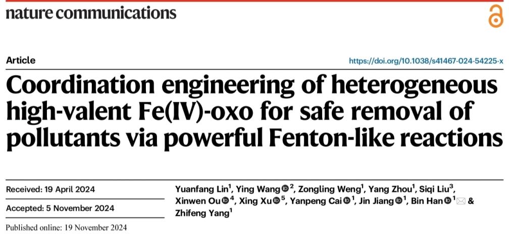 杨志峰院士团队韩彬教授课题组在Nature Communications上发表了“Coordination engineering of heterogeneous high-valent Fe(IV)-oxo for safe removal of pollutants via powerful Fenton-like reactions”的研究论文。韩彬教授为论文通讯作者,漫画人