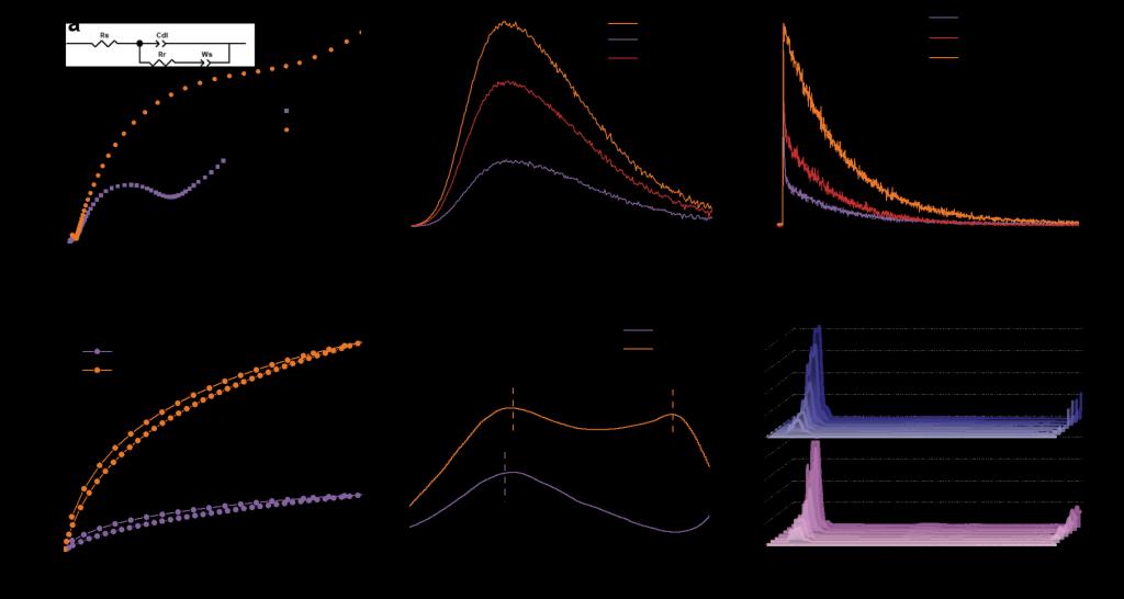 图4.(a)Ni-O4CMOFs和Ni-N4CMOFs的Nyquist图;(b)CO2光还原体系的原位荧光光谱(PL);(c)空白体系,Ni-O4CMOFs和Ni-N4CMOFs在CO2光还原体系中的时间分辨瞬态PL衰减光谱;(d)Ni-O4CMOFs和Ni-N4CMOFs的CO2吸附等温线;(e)Ni-O4CMOFs和Ni-N4CMOFs的CO2-TPD曲线;(f)Ni-O4CMOFs和Ni-N4CMOFs上CO2吸附的原位FTIR光谱。