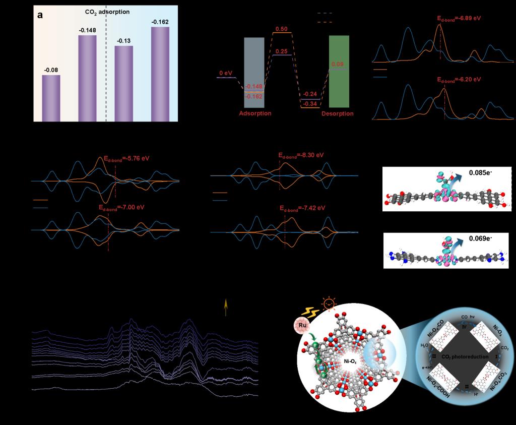 图5.(a)Ni-O4CMOFs和Ni-N4CMOFs的CO2吸附能比较;(b)Ni-O4CMOFs和Ni-N4CMOFs中CO2吸附和活化的自由能图;(c)Ni-O4CMOFs和Ni-N4CMOFs模型中吸附CO2的Ni 3d态密度(PDOS);(d)Ni-O4CMOFs和Ni-N4CMOFs模型中吸附*COOH的Ni 3dPDOS;(e)Ni-O4CMOFs和Ni-N4CMOFs模型中吸附*CO的Ni 3dPDOS;(f)Ni-O4CMOFs和Ni-N4CMOFs模型中吸附*COOH前后的电荷差异图,等值面值:0.01 e Bohr-3;(g)Ni-O4CMOFs的CO2光催化还原的原位FTIR光谱;(h)在可见光照射下,Ni-O4CMOFs光催化剂的CO2光催化还原机制,使用[Ru(bpy)3]2+作为光敏剂,三乙醇胺(TEOA)作为电子供体。