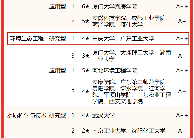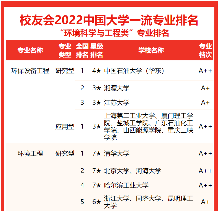 获得中国四星级专业(4★),入选世界知名、中国高水平专业行列,勇夺校友会2022中国大学环境生态工程专业排名(研究型)榜首。