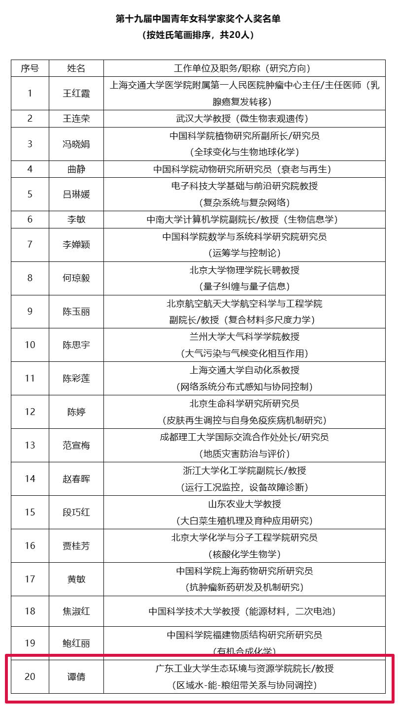 院长谭倩教授获得第十九届中国青年女科学家个人奖,是广东省唯一入选此奖的科学家。