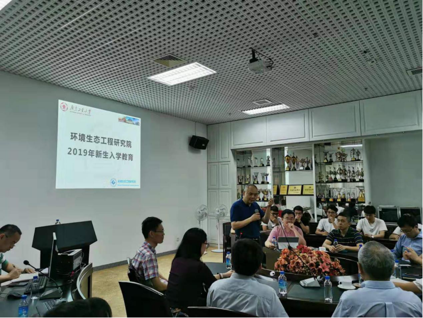 2019级新生入学教育大会在图书馆一楼会议室召开。学校副校长兼环境生态工程研究院直属党支部书记张光宇、党支部副书记曾志英、环境生态工程研究院常务副院长蔡宴朋、副院长何頔及全体研究生导师、2019级研究新生参与本次会议,大会由常务副院长蔡宴朋教授主持。
