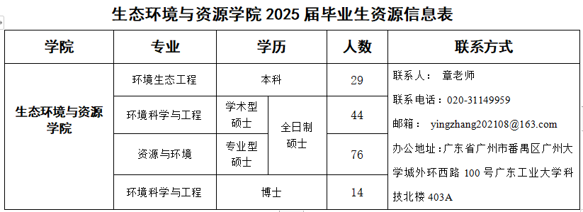近两年硕士毕业生就业率96%,升学率8%。毕业生就业单位主要为广东省生态环境厅主管部门、科研院所、环境监测和环保公司等。部分优秀毕业生前往知名高校继续深造,如中国科学技术大学、北京航空航天大学等。