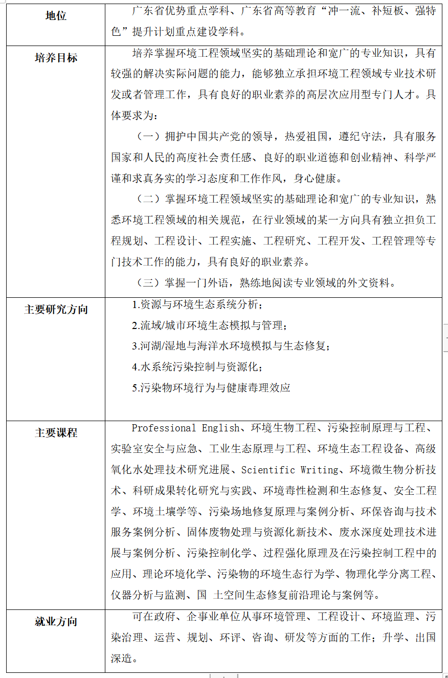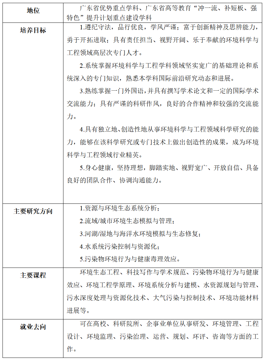学院矢志打造粤港澳乃至全国环境生态领域的前沿科创高地和卓越人才基地,培养具有创新精神的卓越人才,提供基础理论和工程实践关键科技支撑,引领学科发展方向,服务国家生态文明建设战略和地方绿色发展需要。学院全力建设一流的环境科学与工程学科。学科现有环境科学与工程一级学科博士点和硕士点、资源与环境专业学位硕士点、环境科学与工程博士后流动站、环境生态工程(全国首批且地方院校唯一)和环境工程(全国首批)国家级一流本科专业建设点。环境科学与工程学科为广东省优势重点学科、广东省高等教育“冲一流、补短板、强特色”提升计划重点建设学科。ESI环境/生态学全球排名从2019年首次进入前1%上升至2024年4月0.22%,工程学全球排名前0.04%,软科世界一流学科排名环境科学与工程全球前50;泰晤士高等教育中国学科评级A类;校友会2023中国大学一流专业排名环境生态工程专业蝉联全国第一。